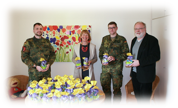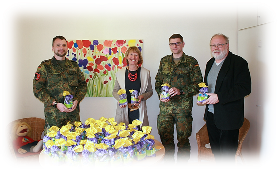 Die Idee und die Umsetzung, die Kinder der Einrichtung mit einer kleinen Spende zu Ostern zu bedenken und so das Osterfest im wahrsten Sinne des Wortes etwas zu versüßen, stammte vom Kameraden Hauptfeldwebel Marco Lorenz. „Wir hatten in letzter Zeit durch die Grippewelle viele personelle Ausfälle, sodass wir mit den Vorbereitungen für das Osterfest etwas hinterherhinkten; da kam die Spende goldrichtig“, so die Leiterin des AWO-Centrums. Was bleibt ist ein ganz herzlicher Dank aus leuchteneden Kinderaugen! Im Bild von Links: HF Lorenz, die Leiterin Beate Krumpipe-Hilkenmeier, OTL Stenzel sowie der stellvertretende Bürgermeister der Stadt Paderborn, Bernhard Schaefer.