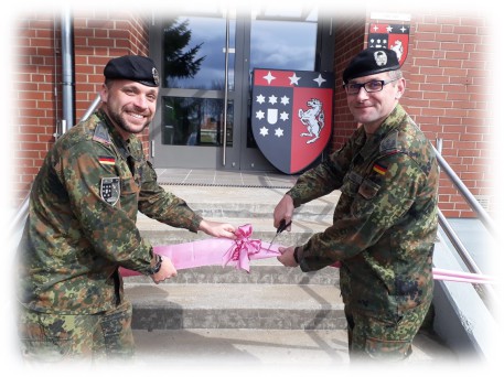 11.03.2019 - Nach dem Aufenthalt im Gefechtsübungszentrum des Heeres in Sachsen-Anhalt, Mitte Februar und vor der internationalen Großübung Allied Spirit X in Hohenfels war es endlich soweit für die „Hacketäuer“ Bataillonsführung. „St.-Barbara-Ring 321“ ist die neue Adresse des Stabes des Panzerbataillons 203 in der Generalfeldmarschall-Rommel Kaserne. Nicht nur auf dem Gefechtsfeld, sondern auch beim Umzug zeigte der Stab, routiniert eine beweglich geführte Operation (Umzug) zu planen und im Tagesbetrieb auszuführen. Im Bild bei der symbolischen Übernahme, Kommandeur Oberstleutnant Jörg Stenzel (r.) und Hauptfeldwebel Marco Lorenz (l.).
