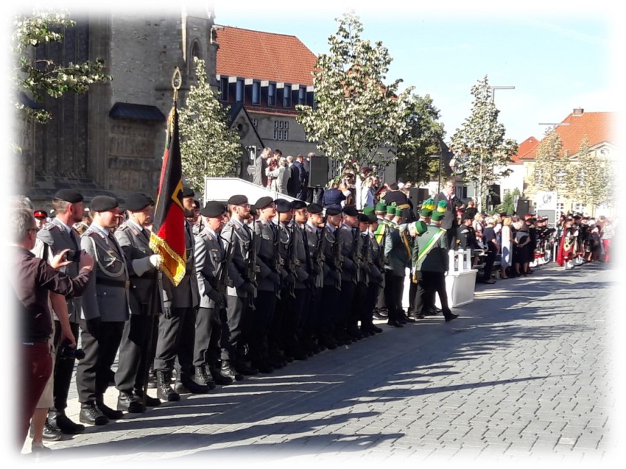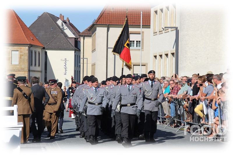 1.400 Soldaten marschierten gemeinsam durch die Innenstadt. Gemeinsam mit zahlreichen Ehrengästen setzten sie damit ein Zeichen für die deutsch-britische Freundschaft, die auch nach dem bevorstehenden Abzug der Streitkräfte Bestand haben soll. Im imposanten zackigen Gleichschritt, Gewehr oder Degen geschultert, die Augen nach links oder geradeaus, etliche Orden an der Uniform und begleitet von verschiedenen Militärkapellen, zogen die Soldaten vom Maspernplatz in die Stadt. Dort gab es einen Vorbeimarsch an Dom und Rathaus, sowie am „Ehrenzug“ der Hacketäuer, bis zum Westerntor, bevor am späten Abend ein eindrucksvoller Zapfenstreich die Großveranstaltung feierlich beendete. Fotos und Bericht tw. Radio Hochstift.