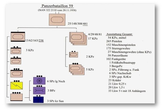 26.05. - Gemäß Umgliederungsbefehl des III. Korps vom 24.04.1959 und Befehl für die Umgliederung vom 26.05., wurde am 01.06.1959 aus dem Panzerbataillon 213 (alt) das Panzerbataillon 214 nach STAN 59 (Stärke- und Ausrüstungsnachweis) durch Teilung neu aufgestellt. Die Neuaufstellung richtete sich nach dem STAN - Entwurf Nr.: 3222110 vom 20.11.1958. Aus Unterkunftsgründen wurde die Personalstärke für beide Bataillone auf 371 Soldaten beschränkt, 16 Offiziere, 129 Unteroffiziere, 226 Mannschaften = 371 Soldaten. Die reale STAN-Aufstellung wurde erst Jahre später erreicht.