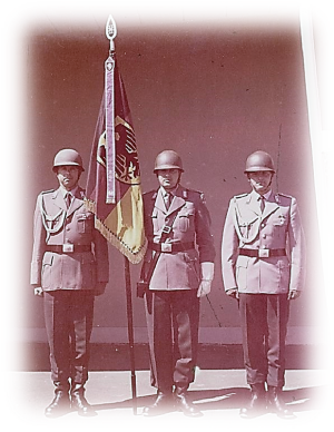Preußen-Stadion von Münster seine Truppenfahne verliehen. Am 28. April erfolgte im Standort AUGUSTDORF die offizielle Übergabe der Truppenfahne an das Bataillon. Das erste Fahnenkommando des Bataillons von links: OLt Wolfgang Naggert, OFw Siegfried Bethke, Lt Jürgen Sasse.
