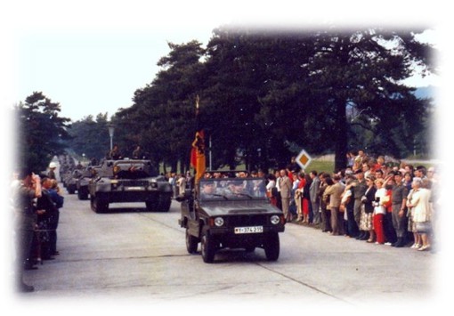 24.06. - Öffentliche Darstellung der Panzerbrigade 21 im Jahnstadion in HERFORD. Dort fand unter großer Teilnahme der Bevölkerung ein feierliches Gelöbnis mit „Großem Zapfenstreich“ statt. Mit dabei waren die Rekruten der 3./214 und der Ausbildungskompanie 10/7.