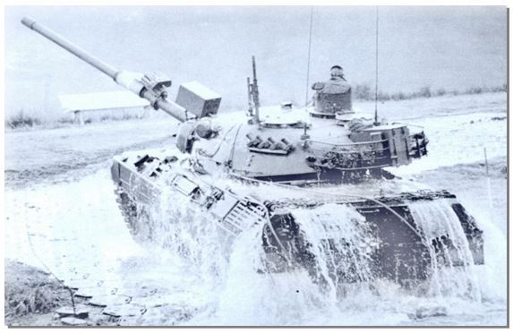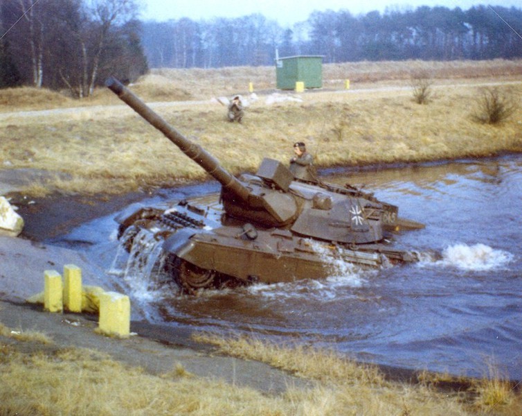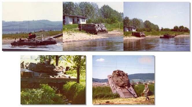 Mai - 214er Offiziersweiterbildung mit der Übung „Wasserschlag“ in GROSSENWIEDEN. Überwinden eines Gewässers - die WESER. B.l. mit Grundschlitten auf M 113. B.M. Absicherung durch Bergepanzer. Doch die Strömung war zu stark, das Vorhaben musste eingestellt werden. Kommandeur Kraus entschloss sich, die Übung umzugestalten. Es sollte nun die Grabenüberschreitfähigkeit des Leo 1 gezeigt werden, leider nur mit mäßigem Erfolg, wie hier das Bilder u. rechts zeigt. - Leo festgefahren!