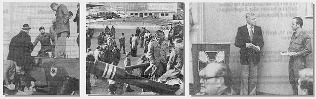 12.04. - Im Rahmen der Brigade führte das Bataillon unter Leitung seines Kommandeurs auf dem Panzerplatz vor zahlreichen Gästen, darunter 150 Paderborner Bürger unter Führung des Kreisvorsitzenden der CDU-Mittelstandsvereinigung Paul Schmandt, eine 90-minütige Waffenschau durch. Hierbei wurde das gesamte Waffenprogramm der Panzerbrigade 21 gezeigt. Hptm Kowalski, KpChef der 2./214, erläuterte die Bewaffnung und technisch refevante Einzelheiten. Zum ersten Mal wurde dabei der in der Erprobung befindliche Leopard II den Anwesenden vorgeführt.